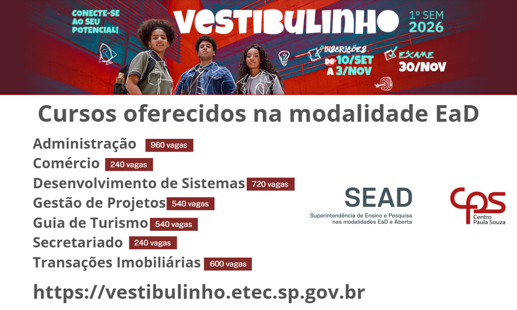 As inscrições para o Vestibulinho 2026 dos cursos na modalidade EaD estão abertas e encerram às 15h do dia 03/11/2025. O Exame será no dia 30/11/25.